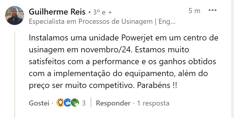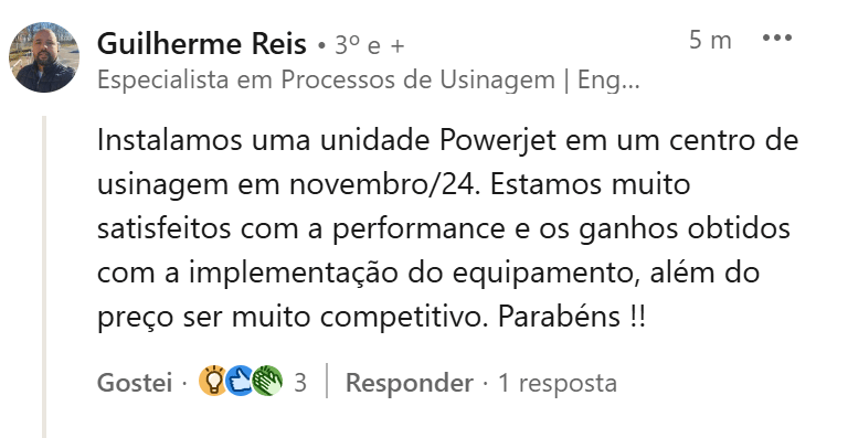 Instalamos o sistema Power Jet em janeiro de 2025 e o resultado é excelente. Como mecânico de manutenção, destaco a robustez do equipamento que opera em 3 turnos sem perder performance ou exigir paradas não planejadas. O controle de cavacos e a estabilidade da pressão são diferenciais que garantem a produtividade total da nossa linha